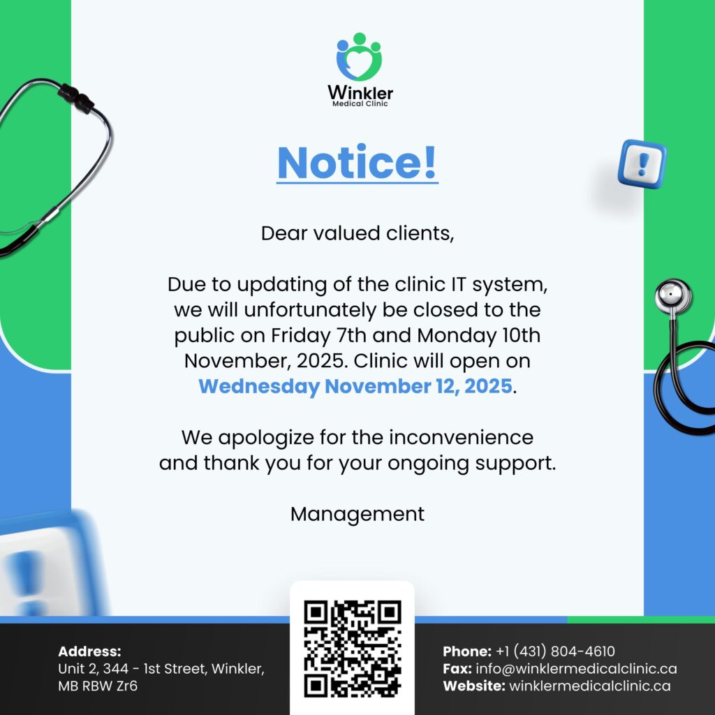 Winkler Medical Clinic is a modern, patient-centered healthcare facility located at Unit 2, 344– 1st Street, Winkler, Manitoba. Committed to delivering comprehensive and compassionate care, the clinic offers services in family medicine, walk-in consultations, preventive care, chronic disease management, and personalized treatment plans.